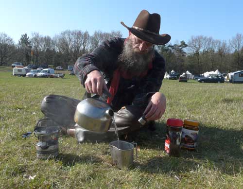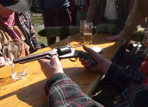 Het Frühlingscamp (lentetreffen) van SV Düring is een feit. Eindelijk, want Hildo heeft er al een hele tijd naar toe geleefd! Het weer werkt mee, want ondanks een frisse wind en nachtelijke vorst valt er geen drupje regen en schijnt de zon de meeste tijd. De opkomst lijkt iets hoger dan bij het wintertreffen, maar het aanstaande zomertreffen spant ongetwijfeld weer de kroon wat bezoekersaantallen betreft. Had Hildo u het al eens eerder verteld? Ook als het geen massale bijeenkomst is hoeft de gezelligheid er niet onder te lijden, daarvan was ook dit treffen weer een stralend voorbeeld. Geen voorladers Dat viel even tegen. Het blijkt dat er tijdens het Frühlingscamp traditioneel alleen met achterladers en 'Unterhebel-Repetierbüchsen' geschoten wordt, dus achterlaad revolvers, enkelschots achterlaadgeweren en Winchesterachtige repeteergeweren. Wat de logica achter deze regel is, lijkt niemand te weten. Tjonge, het moet wel een heel oude traditie zijn... Hildo heeft gelukkig zijn BFR bij zich. Met voorladers schieten mag natuurlijk, maar wel buiten de competitie.