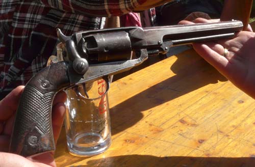 23 april 2010. Schieten met de Navy (1) Percussiekapjes vergeten mee te nemen. Gelukkig is er wat te lenen van iemand. Wel hele oude, die het af en toe niet deden. Soms omdat er zelfs geen lading in het kapje zat (!). Modderen dus. Kapjes vallen er af, eentje komt klem te zitten tussen de hamer en het frame, en daarmee zit de hele boel schocking klem. De hamer wil niet meer vooruit of achteruit. Ook de trommel kan er niet meer af omdat de cilinder blokkeerpin nog omhoog staat. Na wat tikken en kloppen op de revolver, krijgt Hildo uiteindelijk de hamer weer vrij.