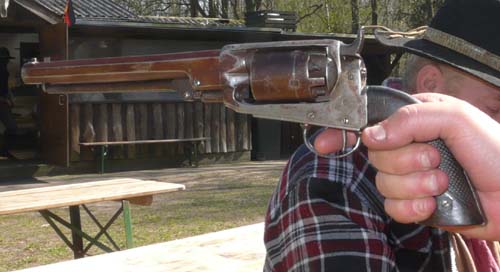 23 april 2010. Schieten met de Navy (3) Kogel in de kamer zonder kruit erachter is een probleem. Gelukkig bestaan problemen niet, alleen oplossingen. Schieten zonder loop heeft Hildo nog nooit gedaan maar hij moet het maar eens proberen. Met een beetje geluk komt de bal de kamer nog uit op de kracht van het percussiekapje. Met de loop ervoor is de kans groot dat hij vervolgens daar in blijft steken. Zonder loop dus. Pats! Helaas, de kogel zit nog precies op dezelfde plek in de kamer. Uw kogel eruit schieten met het percussiekapje lijkt niet mogelijk. Dan de revolver maar gewoon mee naar huis om het schoorsteentje te demonteren en de kogel er met een spijker, vanaf de achterkant uiteraard, uit te tikken. Dat gaat prima.