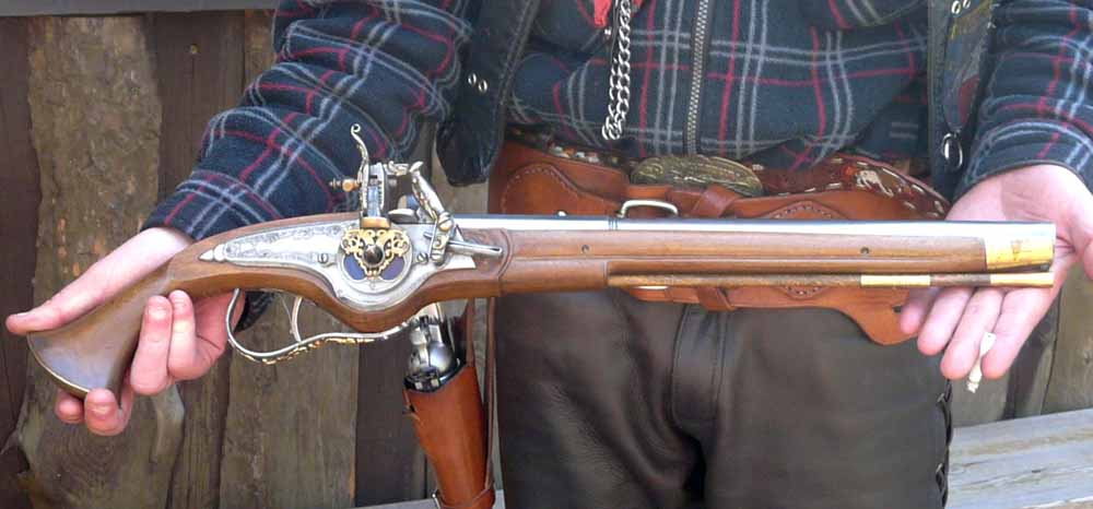 Radslotpistool (klik plaatje 1000 pixels groot) Allerlei verschillende mensen, met allerlei verschillende wapens. Hier in levende lijve een radslotpistool van een Duitse collega schutter. Radslotpistolen zijn eigenlijk de voorlopers van het vuursteenpistool. U dient de veer van het slot op te winden met een sleutel, net als bij een klok. Bij het schieten schraapt een stukje pyriet over een tandwieltje dat door de opgewonden veer aangedreven wordt en vervolgens ontsteekt het pankruit. Oude wapentechnieken zijn hartstikke leuk en een keer een radslotpistool in handen mogen hebben, is zeker de moeite waard. Dit is een Spaanse replica en daarmee is het verlofplichtig in Nederland. Jammer, anders had Hildo hem zo meer naar huis genomen want het is een plaatje!