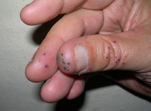22 augustus 2010. Schieten met Vonkie Nou, dat ging niet helemaal lekker zoals u aan de ingebrande kruitresten in Hildo's vingers kunt zien. Het lag overigens niet aan Vonkie, maar aan Hildo's eigen stupiditeit. Na zeven schoten, het gaat prima want het slot is mooi vlot en de precisie lijkt goed, laat Hildo even een andere schutter schieten. Altijd leuk. Helaas houdt de vuursteen het bij het tweede schot voor gezien en reserve vuurstenen heeft Hildo, nog, niet. Om de kogel er toch uit te krijgen is geen probleem, men neme een lucifer en steekt daarmee de kruitvoorraad in de pan aan. Boem! Klaar. Geen probleem, alleen moet u niet uw vingers voor het zundgat houden want daar komt een onder zeer hoge druk staande vuurstraal uit gespoten. Dat weet Hildo natuurlijk best, en tòch... niet bij nagedacht. Na een snelle controle blijken alle vingers nog aanwezig en is het vlot naar de waterkraan om te koelen. Dom, dom, hartstikke dom. Hildo heeft wat bijgeleerd, en u wellicht ook. Blast Tattoo's Zo heet dat in Amerika wanneer men geïnjecteerd wordt met brandende buskruit resten. Als het diep genoeg onder de huid komt, gaat het nooit weer weg. Het schijnt daar vaker te gebeuren dan hier, mogelijk dat het gemiddelde IQ van de Europeaan hoger ligt dan dat van een Amerikaan. U zegt? Hoe Hildo uit een IQ test komt? Wilt u niet weten! In foto's van de schietkaart maken had Hildo geen zin meer, in een bakkie troost wel. Smaakte prima aan de bar, ondanks de zere vingers.