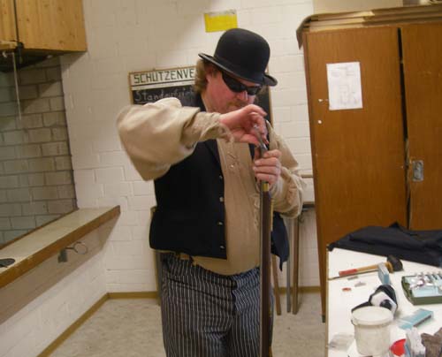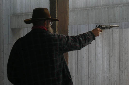 Uitleen Walker Hildo is z'n kruit wel eens vergeten, deze man vergeet z'n revolver. Da's nóg erger, grijnst Hildo. Met de geleende Walker komt hij tot 75 punten, goed voor de tweede plaats bij de dicipline Mariette (voorlaad revolver).