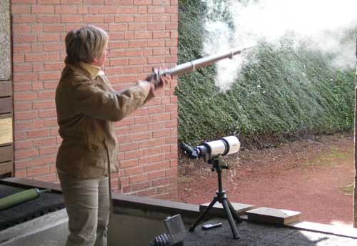 Logun schieten Hildo neemt plaats achter de Logun en probeert een zo stabiel mogelijke positie te vinden. Beetje lastig want de luchtfles, annex kolf, glijd snel van de schouder. Het wapen schiet vrijwel zonder terugslag want het werkt op gecomprimeerde lucht (PCP ofwel Pre Charged Pneumatic), er zijn geen zware veren of andere dingen die zich verplaatsen binnenin het geweer, en dat is een voordeel. Het kogeltje zelf is een gewone 5.5mm diabolo, en die weegt haast niets. De werkdruk ligt hoger dan bij een CO geweer en daarom zit het met de precisie, zelfs op nóg langere afstanden als 100 meter, nog prima. De kolf is de luchttank en er staat maar liefst 200 bar op. Het voorste gedeelte van de loop is geen loop maar een afschroefbare geluiddemper, die de eigenaar heeft gevuld heeft met krulspelden, inderdaad dezelfde als van uw vrouw, en de krulspelden werken in dit geweer misschien wel beter als op uw hoofd. De loop zelf zit er tot halverwege binnenin de geluiddemper. Ondanks het forse vermogen van dit luchtgeweer maakt het tijdens het schieten, dankzij de demper, niet veel herrie en dat maakt gehoorbescherming overbodig. De gemonteerde telescoop vergroot 9x en maakt het doel, op 50 meter afstand, behoorlijk goed zichtbaar. In verhouding tot de richtmiddelen op Hildo's zwartkruit wapens is het een wereld van verschil.
