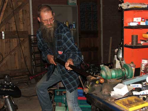 F) Breechplug verwijderen Het Nederlandse woord voor breechplug kent Hildo niet. In de praktijk wordt het onder sportschutters ook gewoon breechplug gemoemd. Het is de plug die achterin de loop van een voorlader zit geschroefd, eraan zit een beugeltje met een gat waarmee de loop aan de kolf kan worden vastgeschroefd. De breechplug wordt in de wapenfabriek gemonteerd en het is niet de bedoeling zo'n ding los te halen, daar wordt het wapen en de breechplug niet beter van. Evengoed, Hildo ziet geen andere optie, dus de Bahco op de breechplug. Die zit, zoals verwacht vast, erg vast. Te vast om los te halen zonder de kans op schade. Loop heet stoken? Het smeltpunt van lood ligt rond 327 graden Celsius, het smeltpunt van staal veel hoger. De gedemonteerde loop heet stoken zodat het lood smelt lijkt een goede optie. Maar als de loop kromtrekt of anderzins vervormt, door eventueel spanning in het staal of onevenredig heet stoken / afkoelen, kan hij het geweer weggooien. Dat zou jammer zijn. Naar Kuiper Hildo begint z'n eigen kunnen inmiddels behoorlijk in twijfel te trekken en besluit, waarschijnlijk verstandig, om Vonkie bij Wapenhandel Kuiper in Blijham af te leveren. Zwartkruitspecialist Pieter heeft er vast meer kaas van gegeten dan Hildo!