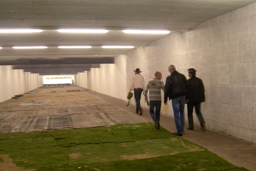 50 meter wandelen naar de 50 meter baan Hildo heeft zijn Brown Bess mee, maar voor de musket is de 100 meter te veel van het goede. De kans op schade schieten is dan aanwezig en dat is niet de bedoeling. De aanwezige aardige nitro-schutter is welwillend en verhuist mee, dichter naar zijn kaart. Tijdens de wandeling naar het 50 meter punt krijgt Hildo de kans de baan even goed te bekijken. De verlichting is ook hier uitstekend, de baan is gevoelsmatig erg ruim, schoon en droog. Als bodembedekker ligt er zand en rechts is een pad waar het prima wandelen is. Wandelen moet u hier hoe dan ook want een ander transport voor uw schietkaart dan uw eigen benenwagen is niet aanwezig.
