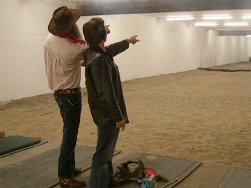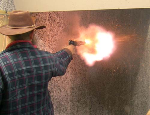Schieten met de Howdah Een volwassen klap hoor!. De trekkerbeugel tikt tegen Hildo's middelvinger aan, beetje auw maar, het valt erg mee. De gebogen grip, gebruikelijk op ouderweste voorlaadpistolen, is niet erg ergonomisch. Ergonomie is een later uitgevonden wetenschap. Dit wapen is een regelrechte funshooter, en fun is altijd leuk!