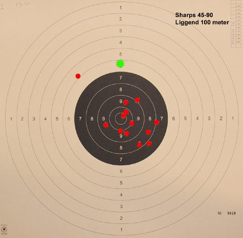 D) Schietkaart Hildo's buurman, ter vergelijk Niet naar de groene treffer kijken, die schoot Hildo er in. Waarschijnlijk schoot de buurman een Sharps in 45-90, maar hier is Hildo niet helemaal zeker van. Het groepje is in ieder geval klein, 91 punten, en daarmee goed voor een zesde plaats. Winnaar Rob kwam tot 95 punten. Da's knap hoor.