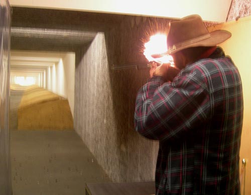 25 meter baan in Hoorn Vanuit de kantine is er direct zicht op de 25 meter baan. Elektrisch kaarttransport, markering van het 12,5 meter punt, een goede verlichting en ruim voorzien van schietpunten. Hildo raakte de tel kwijt, maar het zullen er minstens 10 zijn. De afzuiging voldoet, in ieder geval met twee zwartkruitrevolvers op de baan, prima. Als alle schietpunten bezet zijn door participerende zwartkruitliefhebbers zou u wel eens iemand kunnen horen hoesten, vermoedt Hildo, maar waar is dat niet het geval? Geweren zijn op de 25 meterbaan niet welkom, omdat er gebruik wordt gemaakt van stalen kogelvangers en die kunnen minder hebben dan zand. Voor de lange wapens dient u te verhuizen naar de 100 meterbaan, maar dat is geen straf hoor want het is een hele mooie!