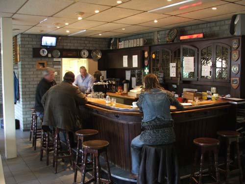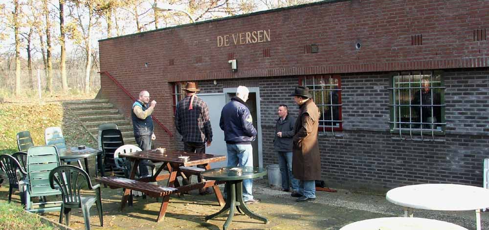 De kantine Tussen het schieten door even een bakkie koffie om weer bij te komen van het vuurwapengeweld. Dat lukt hier prima want de kantine is een prettige plek om te vertoeven. Behalve uitzicht op de actie op de 25 meter baan is er ook ruim uitzicht naar buiten, altijd goed. Rokers, van de niet zwartkruit variant, kunnen buiten gaan staan. In de zomer geen probleem, maar gezien de gure weersomstandigheden laat Hildo zijn shag in z'n zak zitten