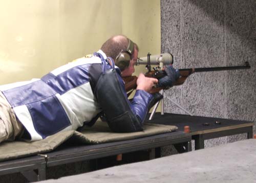 B) 100 meter liggend met Bessie! Knal, en daar gaat de kogel. 'Auw', dat doet pijn. De terugslag van Bessie valt op zich wel mee, ondanks de 110 grain kruit en de 545 grain kogel, maar als u liggend schiet wordt het een ander verhaal. Na de dertien kogels van de serie te hebben verschoten, voelt Hildo's schouder niet meer zo lekker aan. Als Hildo even later in de kantine zit, is de zwelling al duidelijk waarneembaar. Wat precies de goede plek is om de musket tegen de schouder te zetten, weet hij nog niet maar het lijkt erop dat iets verder naar buiten dan gewoonlijk beter is. Leerproces.