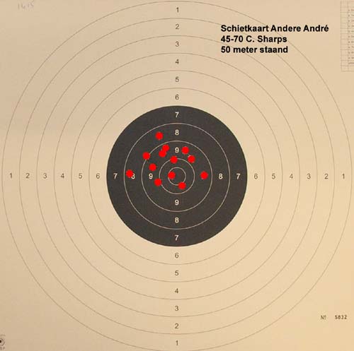 Schietkaart Andere André, ter vergelijk Zo zien 93 punten eruit op de 50 meter, staand met geweer uiteraard. Dit is Hildo nog nooit gelukt en 'Het ziet er ook niet naar uit dat 't 'm ooit wordt', aldus een opgewekte Hildo. Andere André kwam met z'n 93 punten met een C. Sharps op de vijfde plaats. Winnaar Jan, schutter voor de Nederlandse selectie, haalde maar liefst 97 punten(!).