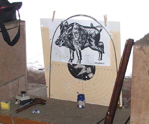 11 december 2010. Vonkie op de 100 meter! Hildo is een beetje geïnfecteerd geraakt door het 100 meter schieten in Venray. Om die afstand te overbruggen hoeft hij nergens heen, dat kan gewoon bij SV Cassidy, zijn eigen club, op de schietbaan in Spijk. Dus voor het eerst proberen. De resultaten Drie keer geschoten, één keer de kaart geraakt. Eerst met 34 grain FFFG Elephant kruit geprobeerd, daarna met, op het oog, iets van 50 grain. De derde keer een dubbele lading van in totaal 68 grain. De richtmiddelen zijn onduidelijk, met name de keep, en Hildo weet dat Vonkie de neiging heeft om te laag af te komen. Bovenin de kaart gericht maar wat er nu precies gebeurt is niet helemaal duidelijk. De kogels zijn gekochte .440 want zijn eigen gegoten .445 waren op. Met één 0.18mm patch, ietsjes los want de .440 kogel is er haast met de vinger in te drukken, en met twee patches wel strak maar dubbele patches is vast ook niet ideaal. Te veel variabelen die de onduidelijkheid alleen maar vergroten. Een volgende keer eens weer proberen op die 100 meter, dan met 50 grain en de normale .445 kogels met een enkele 0.18mm patch. Het geweer aan de voorkant steunen is volgens Hildo ook niet goed, hij heeft het ergens gelezen maar dacht er op het moment niet aan. Ach, hier is nog héél veel te experimenteren en te leren. Vervelen hoeft hij zich voorlopig nog niet!