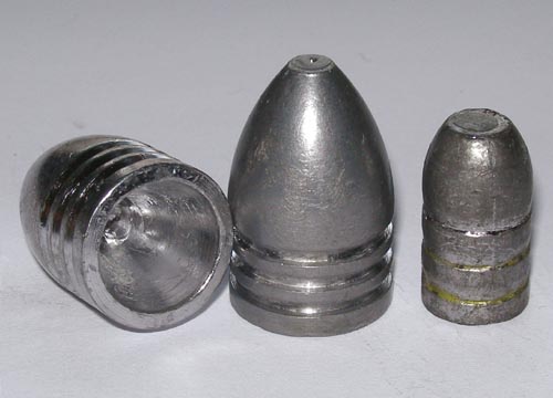 1 februari 2011. Giettangen! Voor zowel Lilly als Vonkie, allebei .45 voorladers, heeft Hildo alleen de standaard .445" giettang voor een ronde bal. Met een pleister (patch) van 0.16 mm ertussen gaat dat uitstekend. Maar, zonder pleister schieten kan natuurlijk ook, maar dan zijn er wel andere kogels nodig. Bovenste foto. De LEE 454-298 minie kogel De minie (spreek uit: mienjee) is in gebruik genomen bij meerdere militaire geweren in de jaren vijftig van de 19e eeuw. Hildo heeft ook al met Josephine geschoten in combinatie met een minie kogel, u heeft er meer over kunnen lezen bovenaan deze bladzijde. Deze .454" minie is wat te groot voor zowel Vonkie als Lilly, maar de andere leverbare giettang is .450" en dat kon wel eens een beetje te klein zijn. Hildo heeft al een keer geschoten, met Lilly, met een 452" minie kogel, alleen die was wel gesized van 454 naar 452 met een 452 sizerdie van LEE. Die 452 sizerdie heeft Hildo inmiddels ook, dus hij kan zijn eigen 452 minie kogels maken. Middelste & onderste foto. De LEE 450-200 & 450-250 REAL kogel REAL betekent Rifling Engraved At Loading. Kortom, de kogel is iets te groot voor de loop, maar u tikt hem in de loop en tijdens het laadproces worden de velden in de kogel gesneden. Hildo had al een REAL giettang in .500" en die deed het, verbazingwekkend, het best in Tijgertje, Hildo's Rolling Block. Maar deze REAL kogels zijn uiteindelijk gemaakt voor voorladers, dus Hildo is benieuwd hoe deze kogels het gaan doen in Vonkie en Lilly.