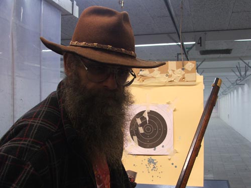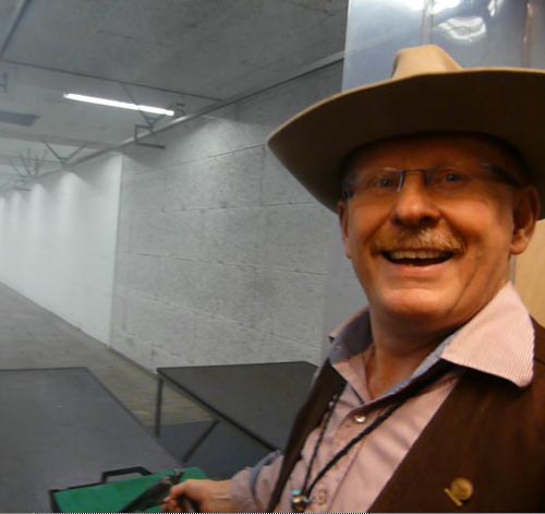 Jeroen met de Walker Hier schiet Jeroen voor de eerste keer met Hildo's Walker, eerst even met twee handen, want 'Tjonge, is dat ding zwaar zeg!'. Wèl dikke klappen, maar tegelijkertijd is het ook een erg vriendelijk schietende revolver, zoals de meeste zwartkruitwapens. Twee trommels verder en alles zit in de kaart, er is zelfs sprake van een echt groepje. Helemaal niet verkeerd, want Hildo kent legio schutters die in eerste instantie dusdanig geimponeerd zijn door de Walker dat de kaart soms helemaal gemist wordt. Het schieten zelf valt Jeroen uiteindelijk erg mee want het is hem opgevallen dat, waneer je zelf met de revolver schiet, je helemaal geen last meer hebt van de drukgolf van het schot. Als je er schuin achter staat, terwijl een ander schiet, is dat heel anders!