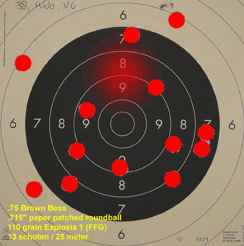 Als van een leien dakje Alle dertien kogels de loop uit zonder problemen. Alleen het laden werd op een bepaald moment wat moeizaam. Gelukkig sprong Hildo te hulp die met zijn Walker de pompstok toch weer naar benden wist te meppen. Bij het volgende schot, behalve de kogelvetpillen, ook even een flinke rochel in de loop. De volgende kogels glibberden zo naar beneden. Toch, om de gaten allemaal in het midden te krijgen: Het blijft lastig met zo'n Brown Bess, en niet alleen voor Roelof! Resultaat: 9 punten