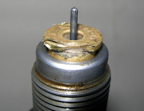 11) Panlubing. De gevette kogel De linker kogel zit nog in het vet, de rechter is er bijna helemaal uitgedrukt. De panlube methode werkt! Het is simpel, goedkoop en het resultaat is uitstekend. 'Elk voordeel heb ze nadeel', zei een bekende Nederlander eens. Deze gevleugelde uitspraak is ook van toepassing op het panluben. 'Het resultaat is goed maar het is wel een hoop werk', aldus Hildo die liever lui dan moe is. Deze kogels zullen ingezet worden als projectiel voor Tijgertje, Hildo's Rolling Block geweer. Maar voor het zover is moeten de patronen nog gemaakt worden, en da's werk voor een andere keer. ______________________________________