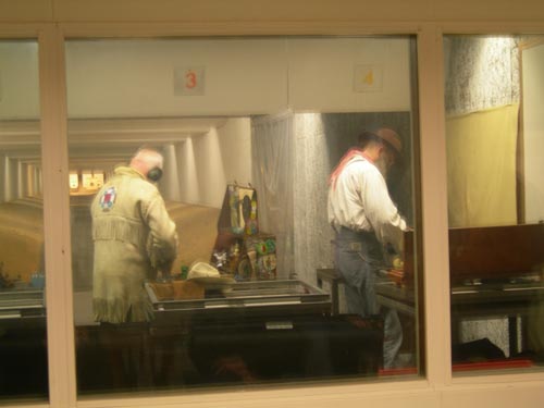 Naar de achterzijde De achterkant van de winkel herbergt het zwartkruitgebeuren. Op de achterwand hangen, hier nog net zichtbaar, de zwartkruitgeweren. Wat Sharps- en voorlaadgeweren, maar met name de Winchester-achtige wapens zijn er in allerlei soorten en maten te vinden.
