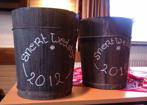 15 december 2012 - Snertwedstrijd van The Poachers Het is u wellicht opgevallen dat Hildo wat minder westernevenementen bezoekt. De reden is simpel: het scheelt aanmerkelijk in zijn portemonnee. De wekelijkse serie schieten bij zijn eigen club betekent voor Hildo185 kilometer rijden. Dat tikt aan. Soms heeft hij wel twee keer per week zin om te gaan schieten. Dat is geen probleem, maar betekent wel dat hij het wat rustiger aan moet doen met evenementen. Het wekelijkse schieten gaat gewoon door want voor Hildo is het schieten zèlf uiteindelijk de doorslaggevende factor. Maar de Snertwedstrijd is altijd speciaal voor hem geweest, ook al omdat dit het eerste westernevenement was dat hij ooit heeft bezocht, 10 december 2005, destijds nog zonder verlof. Dus... op naar Brummen! Dierkaarten en Quigley-emmertjes Er wordt geschoten op een kaart met een beer en er kan ook worden geknald op een miniatuur zinken emmertje dat met een draadje voor een reguliere schietkaart hangt. Vijf schoten per kaart. Het emmertje schieten kost 5 euro, een dierkaart 3 euro. Bij elk schot meer volgt er puntenaftrek 13 schoten De reguliere MLAIC (Muzzle Loaders Association International Commitee, het overkoepelende orgaan van de zwartkruitschietwedstrijden op topniveau) regels gaan uit van 13 schoten op de kaart waarbij de hoogste 10 tellen. Hildo heeft gemerkt dat met name in Duitsland er vaak op dierkaarten geschoten wordt met minder schoten. Tòch vindt hij dat het normale 13-schoten systeem wel wat heeft. Met name met een voorlader bent u met 13 schoten lekker lang bezig: vijf schoten zijn wel erg snel voorbij. Natuurlijk is het ook mogelijk wat meer kaarten te nemen. Net wat uzelf wilt.