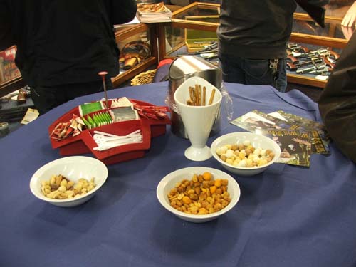 Hapje en drankje Borrelnootjes, zoutstengels, koekjes en allerlei andere knabbels zijn op allerlei plaatsen in de zaak te vinden. Hildo's handje verdwijnt diverse malen in één van de bakjes. Een dwangmatige handeling, daarom heeft Hildo thuis nooit iets om te knabbelen want dan wordt het bunkeren tot ie er misselijk van is, en da's helemaal niet leuk.