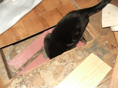 24 januari 2015. Kat onder de vloer Bijtie, Hildo's kat is niet bang voor een bruine rat en meent ook dat het tijd is voor een inspectie. Nadat hij weer is opgedoken en Hildo een kopje koffie en een kleine versnapering tot zich heeft genomen, wordt het tijd voor een nieuw stukje hout. Dan kunnen de houtwormen weer een paar jaartjes kauwen voordat Hildo weer door de vloer zakt. De herlaadplek is voorlopig weer zeker gesteld. Nu nog een tafeltje.
