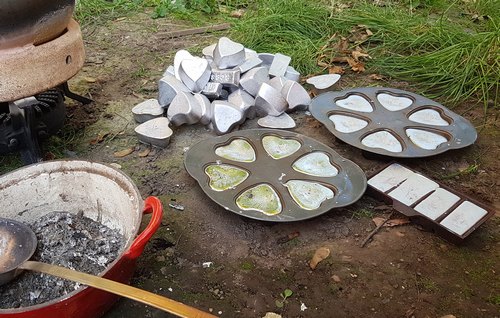 Een kleine 50 kilo gehard loden hartjes Het is duidelijk wat grijzer en minder glimmend dan puur lood en het oppervlak een soort kristal structuur, komt van het antimoon weet Hildo nu. Enne... Als u zelf met lood smelten of gieten aan de gang gaat... past u wel op? Verbranden aan kokend water is ernstig maar gesmolten lood (vanaf 357 graden tot gemakkelijk over 400 Celsius!) is ook niet te onderschatten. Rustig en voorzichtig werken is noodzaak en houdt water uit de buurt want water in gesmolten lood geeft explosieve verschijnselen met kans op rondvliegend gesmolten lood. Natuurlijk altijd buiten smelten of met een zeer goed werkende afzuiging want het spul is giftig.