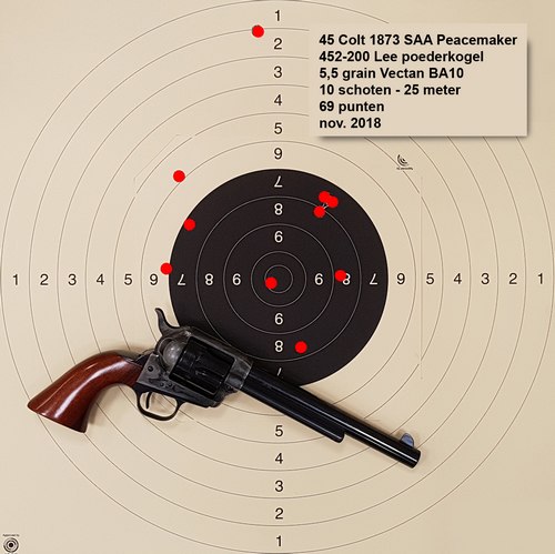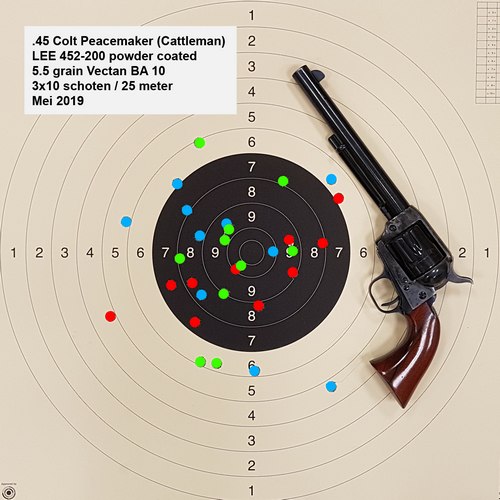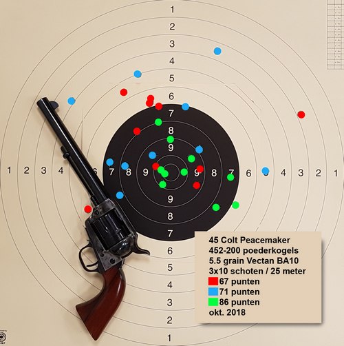 ![]() 10 oktober 2018. De Margolin dan? Als het met de Peacemaker niet lukt, dan proberen met de Margolin. Dit voormalig olympische sportpistool uit de eveneens voormalige USSR is destijds ontwikkeld door een blinde(!) man. Een staaltje Russische precisie uit de jaren 50 van de vorige eeuw maar kwaliteit blijft kwaliteit. Grote groep Dat Hildo niet in het midden schiet komt omdat het wapen niet op Hildo's ogen is afgesteld. Maar de afmeting van de groepering verraad alles en Hildo kan u alvast verklappen dat het niet aan het pistool ligt. Of zou het er mee te maken hebben dat ie de laatste tijd zo weinig geschoten heeft? ![]() (1) 13 oktober 2018. Poederkogels ofwel... Powder coated bullets! Poedercoaten is een procedé waarbij plastic om metaal gesmolten wordt. Het poeder blijft elektrostatisch aan het metaal kleven en daarna gaat het object een oven in waar het poeder vloeibaar wordt en uiteindelijk een mooie supersterke, veel sterker dan lak, laag geeft. Het bladdert zo maar niet af. Zo is Hildo´s frame van z'n Harley is destijds in 1992 gecoat en het houdt tot op de dag van vandaag in principe prima. Kogel poedercoaten Het poedercoaten van kogels is geen nieuw fenomeen, Youtube staat er vol met how-to filmpjes. Ook gerenommeerde fabrikanten als het Duitse Handler & Natermann hebben kleurig gepoedercoate kogels in hun assortiment, Hildo heeft er ooit eens mee geschoten. Het is niet geschikt voor high performance geweerkogels maar voor wat Hildo er mee wil is het wellicht een goede vervanger voor kogelvet. Waarom coaten? In principe moeten loden kogels, als er geen mantel omheen zit van koper of messing, gevet worden. Met kogels die gepoedercoat zijn is dat, als het goed is, niet meer nodig. De poedercoating zou de kogel voldoende moeten beschermen tijdens de korte maar heftige reis door de loop. Als het niet goed werkt is dat snel genoeg te zien aan lood in de loop, meent Hildo. Het coaten Simpel, u ziet het hierboven. In een bakje gooien samen met wat poedercoat in de kleur van uw smaak, Hildo kreeg gratis wit poeder dus kleur bekennen is geen probleem. Dan het bakje een beetje ronddraaien zoals u dat ook met Lee's Liquid Alox zou doen. Loden kogels zijn niet statisch maar ook zo blijft er zonder verdere problemen een superdun laagje poeder aan de kogels zitten. ![]() (4) Gebakken kogels Het poeder is mooi om de kogels gesmolten maar sommige zien er wat verbrand uit, er kwam ook een hoop stinkende witte rook uit het oventje. Hetzelfde probleem had Hildo ook al met broodjes die 15 jaar geleden in de oven gebakken werden. Een goede temperatuurregeling is noodzakelijk, ook bij kogels bakken. ![]() ![]() (6) Het verschil van coat en geen coat Sommige kogels zijn iets groter, andere iets kleiner maar in principe komt het erop neer dat de kogel van 452 naar 454 gaat. Die 454 is, denkt Hildo, ook zo'n beetje de maximale maat die de kogel zou mogen hebben om fatsoenlijk te kunnen herladen. Het is ook de maat de Magtech gebruikt in hun cowboy-load munitie en moet daarmee veilig zijn voor alle replica's. Als de huls te groot wordt in diameter is ie ook niet meer te laden in de trommel. Op maat sizen naar 452 kan natuurlijk altijd, Hildo heeft een 452 sizer-die liggen want het is ook de maat waarmee de kogels voor Eleanor gesized worden, van 453 naar 452. ![]() (8) 45 Colt poederpatronen Hier ligt de eerste serie patronen. In totaal zijn er iets van 100 kogels gebakken schat Hildo. ![]() 14 oktober 2018. 60 stuks 45 Colt patronen De lage ronde bakjes van de IKEA zijn volledig luchtdicht. Misschien helpt dat ook wel om zwartkruit patronen langer in goede staat te houden. Het messing van de hulzen heeft bij Hildo in huis de neiging om zwarte vlekken te krijgen of zelfs groen uit te slaan als het een beetje in contact komt met zijn kogelvet en zwartkruit zelf is hygroscopisch. 60 stuks voor de baan Om patronen mee te nemen naar de baan lijken deze bakjes prima. Er passen gemakkelijk 60 patronen 45 Colt in. Meer dan voldoende voor een avond schieten. Makkelijk vullen Een gewone patroondoos moet gevuld worden, patroon voor patroon en dat duurt erg lang. Gewoon erin kwakken is natuurlijk stukken sneller, nadeel is dat u geen preciese controle heeft over de patronen. Slaghoedjes die uitsteken, achterstevoren zitten of helemaal missen, heeft u dan niet in de gaten. ![]() (2) 17 oktober 2017. Uitstekend slaghoedje Na de eerste schietkaart een storing. Tijdens het laden loopt de trommel vast, wil niet meer voor of achteruit. Tot tweemaal toe haalt Hildo de trommel uit de revolver en tot tweemaal toe loopt ie weer vast. Dan pas ziet hij de patroon waarvan het slaghoedje iets buiten de huls uitsteekt. Dát krijg je ervan met die gemakkelijke ´kieper er maar in zonder er verder naar te kijken´ patroondozen. ![]() (3) 17 oktober 2018. Tweede serie met poederkogels. Goedgekeurd! Na het slaghoedje probleem nog twee series, nu hoger gericht, onderkant zwart tot iets in het zwart. De rode gaten: 63 punten De eerste serie, eigenlijk de vierde van deze avond, dus dat de groepering steeds verder uit elkaar komt te liggen verbaast Hildo niets. De blauwe gaten: 89 punten! De 5e serie van deze avond, Hildo verwacht er niet veel meer van... Maar hoe is het mogelijk? Hier schiet hij zomaar 89 punten en... wat een groepje daar in het midden! Of de kruitlading van 5.5 grain Vectan of poederkogels nu wel of niet goed schieten is hier duidelijk geworden. Vier in de 10 en vier in de 9 is teveel voor toeval, toch? ![]() 24 oktober 2018. Nog drie series Nog wat patronen over van de vorige keer. Ditmaal drie weigering, slaghoedje is goed ingedrukt maar hij gaat niet af. Of het een Ginex of S&B primer betreft weet hij zo niet, er is wat door elkaar gebruikt. Niet goed als het om precisie gaat natuurlijk. Ook merkte hij dat er in één kamer een patroon moeilijk te laden was, in de andere kamers niet. Deze Uberti is niet van de kwaliteit/precisie die zijn BFR wel heeft, da's duidelijk. Misschien moet er een kamer iets geruimd 