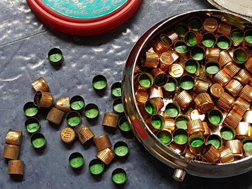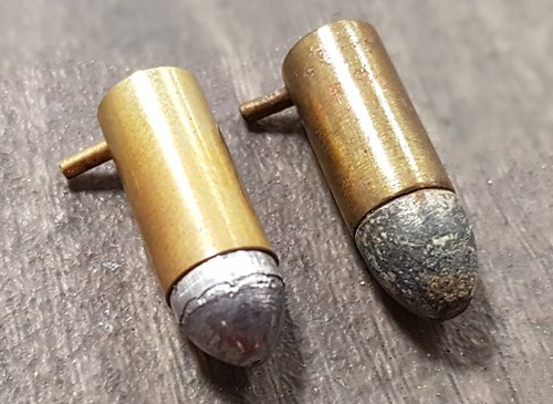 Randvuur slagpin In tegenstelling tot centraalvuur patronen, die met het slaghoedje in het midden die verwisseld kan worden, ziet u hier ook waarom een 22 randvuur niet herlaadbaar is. Het slagsas zit in de rand van het messing hulsje verwerkt, de huls componenten zijn derhalve 'one-piece'. Doet ie 't wel of doet ie 't niet? De linker 22 short is gewoon afgegaan, u ziet de deuk. De rechter 22 long rifle heeft geweigerd. Deze patroon komt uit Gorby, het Baikal Margolin MCM .22 Russische Olympische snelvuurpistool. Er is een punt gemaakt aan de slagpin, maar die punt zit vreemd genoeg niet in het midden. Als de slagpin 180 graden draait pakt ie de huls te ver naar de rand toe, weigering. Onduidelijk waarom de slagpin opeens draait, er wordt aan gewerkt.