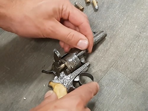 10 juli 2019. De 7mm penvuur revolver van Napoleon Nummer 2 onder de ivoren grips. Verder is er geen enkele stempel of inscriptie op het wapen te vinden wat meer duidelijkheid geeft over de herkomst, het verleden of de maker. Ook de eigenaar weet verder niets over de historie van het wapen te vertellen. Het zal hoogstwaarschijnlijk Belgisch of Frans zijn, speculeert Hildo. Met name in België zijn veel penvuur wapens gemaakt. Uit betrouwbare bron hoort hij dat dit wapen ook wel wat Duitse invloeden laat zien. De eerste penvuur revolvers kwamen in 1854 op de markt en bij de Franse marine werden ze zelfs in 1858 ingevoerd. Erg populair zijn militaire wapens met het penvuur systeem echter nooit geworden. Penvuur met een brug! Hildo heeft nog nooit veel met penvuur wapens gehad maar de revolvers zien er vaak een beetje hetzelfde uit, in zijn beleving in ieder geval. Maar deze revolver is uitgerust met een brug boven de trommel en dat is zeldzaam. Reguliere penvuur revolvers hebben vrijwel allemaal een open top, naar het schijnt geïnspireerd door de Colt 1851 voorlaad revolver.