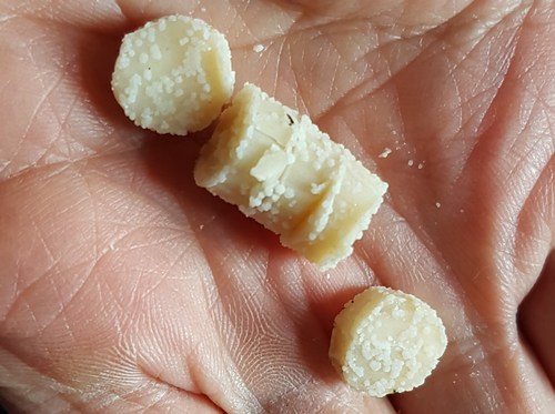 .22LR S&B Standard LRN 40 grains. 39.8 grain kogel en 1.4 grain 'balletjes' kruit. De Sellier & Bellot .22 long rifle patroon heeft een zwaardere kogel en meer kruit, zal wel harder gaan dan. En dat doet ie ook. Er zit een soort van 'lining' in het long rifle hulsje, om het kruit tegen vocht te beschermen? De grotere stukjes die u ziet liggen zijn van die lining. Het lijkt wel een soort vetpapier. ---------------------------------------------