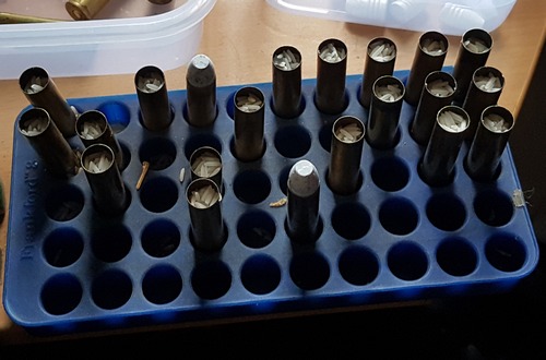 25 juli 2019. Trailboss 13 grain Zestig patronen Trailboss gemaakt, het duurt even op de single stage Rock Chucker maar ze komen er uiteindelijk wel. De ladingen worden door een Lyman No. 55 Classic in de hulzen verdeelt. Een prima kruitmolen, best prijzig en voorzien van een fijn instelbare maar ergerlijk slecht leesbare kruit gewichtsindicatie, u heeft geen idee van de initiële kruitafgifte en ook verder is het op goed gelukt wat schuiven tot de gewenste hoeveelheid uiteindelijk gegooid word. Ook geschikt voor zwartkruit, helaas met een body van gietijzer wat weer iets roestgevoelig is aan de binnenkant. Af en toe de handvat bewegen, ook als er niets in zit, is het beste om alles mooi gangbaar te houden. Misschien ligt het aan het vochtgehalte van Hildo's huis maar hij hem toch liever in een roestvaststalen uitvoering gezien. Niets is perfect. Checken Kruit checken doet de Dillon XL650 zelf maar single stage moet alles zelf gecheckt worden. Zaklamp erbij en kijken of overal ongeveer de gelijke lading Trailboss in ligt. Het lijkt goed. Kogel erop, krimpen en klaar alweer. Zwartkruit? Als u dacht dat Hildo nitro inmiddels leuker vindt schieten, zit u ernaast. Hij wacht nog steeds op de beloofde investering in een verbetering van de afzuiging. Jammer maar geduld is een schone(re) zaak, op meer manieren dan één.