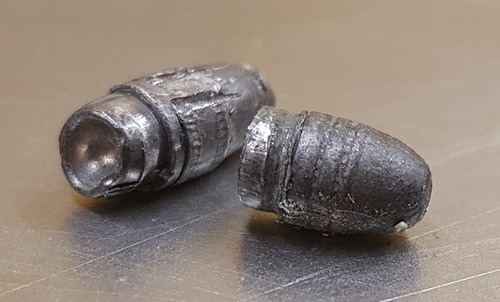 Lyman 457-292 (boven) vs LEE 457-340 (beneden) Hildo is weer aan het kogelgieten geweest en omdat de Lyman tang maar één kogel per keer giet en de LEE 2 stuks per keer. Vandaar dat hij ook een paar LEE kogels heeft gegoten. Het giet dubbel zo snel maar ze zijn met 340 grain bijna 50 grain zwaarder en dat betekent meer terugslag, lager richten dan met de Lyman van maar 292 grain en natuurlijk hogere loodkosten. Hoe het schiet is natuurlijk van belang dus... proberen! De poedercoating Het is u de laatste tijd vast opgevallen dat Hildo voor gegoten kogels in combinatie met nitro helemaal om is naar poedercoating. Het werkt naar zijn idee prima, is sneller en gemakkelijker aan te brengen. Als u de hierboven afgebeelde kogels ziet valt u vast op dat de coating er niet direct perfect dekkend op zit. Dat lijkt in de praktijk niets uit te maken wat afzettingen betreft. De lopen van zowel de Peacemaker als de BFR blijven prima schoon en van enige vorm van afzetting is hem nog niets opgevallen.