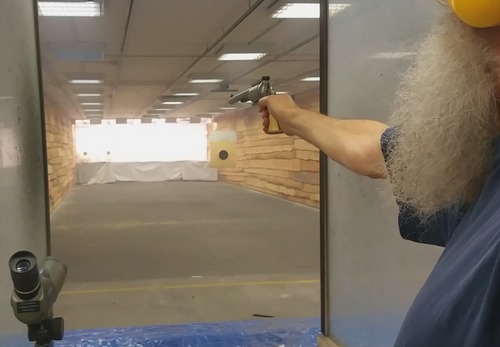 10 augustus 2019. Allez met de Peacemaker Nog even een paar series, het kan nu nog want met de patronen wordt het hard minder en kogels heeft hij niet meer. Echt goede scores zitten er niet bij, de vierde en laatste serie laat 80 punten zien, het hoogste van deze dag en voor Hildo's doen best redelijk. 50 meter Dan naar de 50 meterbaan want er ook Hildo heeft ook Eleanor meegenomen en daar heeft hij al veel te lang niet mee geschoten.