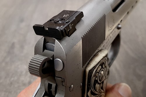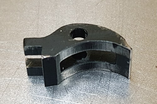Match keep Dit is een custom oplossing die het net niet helemáál was. Mooi precisie ding hoor, alleen jammer dat ie niet erg ver naar beneden kan omdat ie tegen het materiaal van de slede aankomt. Deze slede is gemaakt voor gebruik met een vaste keep. Foto's van andere Springfields met een verstelbare keep laten zien dat er een stuk van de slede gefreest is om ruimte te maken voor de verstelling naar beneden. Dusty komt nu een beetje hoog af. Gelukkig is een vijl een handig stuk gereedschap, mocht het nodig zijn.