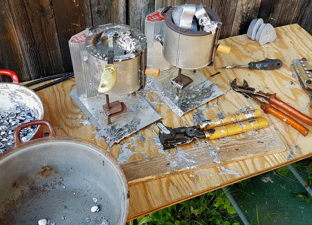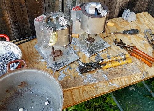 22 augustus 2019. Loodexplosie (klik foto groter) Hildo wil nog even de rommel van de linker loodoven afscheppen alvorens verder te gieten. Een letterlijke knal en het vloeibare lood van tegen de 500°C wordt rondgeslingerd. Hij springt ruggelings achteruit, zo snel mogelijk bij het lood weg want wat er gebeurt beseft hij op dat moment niet, wel dat hij zo snel zover mogelijk van het lood weg moet. Hij valt op de grond en checkt met de hoogst mogelijk snelheid zijn lichaam om lood te kunnen verwijderen voordat het te ver inbrandt. 'Potverdorie'!, schreeuwt Hildo, en dat is de genuanceerde versie. Brandwonden? Gelukkig vallen de brandwonden mee. Als altijd draagt Hildo relatief beschermende kleding. Het is vrij warm maar een T-shirt is niet genoeg, een katoenen overhemd en lashandschoenen zijn minimaal. WTF is hier gebeurt dan? Hildo is altijd zo voorzichtig en tóch gebeurt iets wat nooit had mogen gebeuren. Na de brandwondjes op de rechter arm even onder de kraan te hebben gehad giet weer verder nu met zijn leren motorjas aan, onderwijl zich zwetend afvragend wat er nu eigenlijk gebeurt is. Duidelijk water in het lood, maar hoe dan? En na een poosje gaat het lampje branden... Schoonmaken van het lood. Als een nieuwe lading lood gesmolten is, Hildo gebruikt 2 loodovens voor een continue-gieten zodat de gietmal niet afkoelt. Met de ene wordt gegoten, de andere smelt nieuw lood voor een volgende sessie. De ene oven is net weer gevuld en Hildo schept de rommel van de volle loodpot af alvorens verder te gieten, op dat moment is de explosie. Er zat water aan de scheplepel. De scheplepel lag in de grijze pan, die had Hildo in het begin van de gietsessie op de grond gezet omdat die grijze pan in de weg stond tijdens het openen van de snijplaat. De afgesneden stukken lood van de gietmal komen in de witte pan. De grijze pan dus op de grond en de witte pan dichterbij getrokken. Nadat de rechter loodoven leeg was, de witte pan weer naar achteren geschoven en de grijze pan, met scheplepel, weer op de tafel gezet om de rommel van het lood te kunnen scheppen van de linker loodoven. Emmer met water Een emmer met water heeft Hildo veel verder naar links op de grond staan, ver van de loodovens vandaan. In de emmer leegt hij de giettang waarin de kogels sissend vallen. Komen ze zacht terecht en worden zo ook nog een keertje gehard. Denkfout Het probleem is, u ziet het misschien al aankomen, is de grijze pan met scheplepel die Hildo op de grond gezet had omdat die in de weg stond. Vanuit de emmer met water is in die pan wat water gespetterd en ook op de scheplepel. Dat had Hildo niet in de gaten, en er niet bij nagedacht. De scheplepel ligt nog op de loodoven, en als u goed kijkt kunt u nog een paar waterdruppels in de grijze pan zien liggen die het gebeuren initieerden. Een enkele waterdruppel is genoeg om gewelddadig (explosief) in gasvorm te worden omgezet als het onder het vloeibare lood komt. Sukkel! Echt wel, maar het is een indirecte fout geweest door niet stil te staan bij een onbenullige handeling (ruimte maken) die in eerste instantie niets met de combinatie water en lood te maken leek te hebben. Denkfout en Hildo heeft ervan geleerd. Als dit ongeluk iemand anders kan behoeden voor brandwonden is dit stuk al de moeite waard geweest. Lood en water blijft een bijzonder gevaarlijke combinatie. En altijd beschermende (katoen smelt niet maar lood gaat er wel door, net als water, zolang het vloeibaar is weet Hildo nu) kleding, handschoenen, oogbescherming en hoofddeksel dragen. Overdreven? Als u toch liever in uw zwembroek lood giet, Hildo heeft er geen probleem mee hoor! Lood op of onder het lood oppervlak? Zolang er een drup water bovenop het lood valt schijnt het mee te vallen, u kent het fenomeen wellicht. Een rond bolletje water wat een poosje rond ´stuitert´ op het hete oppervlak zonder snel te verdampen. Het lood met water probleem ontstaat als er water onder het gesmolten lood oppervlak belandt, dat explodeert en gooit het lood de oven uit. Riskante dingen zijn de scheplepel, koude (en daardoor mogelijk iets vochtige) gietlepels en andere dingen die u eventueel in de loodpot doopt zonder dat ze 100% droog zijn. Ook riskant is dingen in reeds gesmolten lood gooien, als er iets van vocht aan zit kan het exploderen. De volgende keer legt Hildo de schep en gietlepel op de oven zodat ze 100% droog zijn alvorens ze in het lood onder te dompelen.
