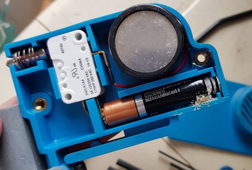 23 maart 2013. Corrosie in de primer warning system van de XL650 Hildo wil wat gaan herladen merkt dat er wat mist is met de pers. Deze batterij zit in het apparaatje wat de slaghoedjes in de gaten houdt op de Dillon XL650, tijdens het herladen. Als de primers opraken begint het apparaatje te piepen doordat het een schakelaartje bedient word door een langzaam naar beneden zakkend staafje, maar het piepje werkte ditmaal niet merkte Hildo. De batterij blijkt er slecht aan toe. Gelukkig is het kastje zelf nog okay, met een oplaadbare kwaliteitsbatterij van Eneloop werkt het systeem weer perfect. De batterij van de 'zit er kruit in de huls voeler' binnenkort ook even controleren en preventief vervangen, denkt Hildo.