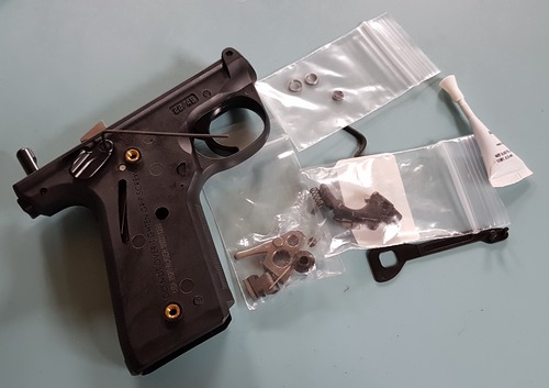 11 september 2021. Volquartsen match trekkergroep installatie Vrijwel alles in de originele trekkergroep van de Ruger 22/45 Mark IV wordt vervangen. De operatie stokte even, maar met dank aan Wim Slendebroek, die een boutje wist los te krijgen wat Hildo niet lukte, kon de installatie verder gaan. Met hulp van Aaltje, want het is niet echt moeilijk maar wel priegelwerk. Een handleiding ontbreekt maar Volquartsen heeft een prima Youtube video waarop de installatie stap voor stap goed is te volgen. Resultaat? Een fantastische trekker! U haalt hem naar achteren, zonder weerstand, tot ie opeens 'vast' zit. Rustig de druk opvoeren tot ie voorspelbaar en vrij licht afgaat. Geen piep, sleept of kraak. Het kostte wat maar het is echt een hele fijne, heeft wel wat van een lichte 1911 trekker.