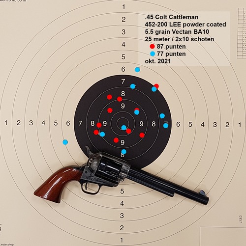 13 oktober 2021. De eerste twee na de vakantie Het begint goed, zeker nog onder invloed van z'n Bourgondische reis! De eerste series is de beste met 87 punten, daarna werd het 77 om vervolgens bij de derde serie naar 74 te zakken. Hildo gooit de patronen terug in z'n ammo-sok en stopt de revolver terug in het holster. Over voor vandaag!