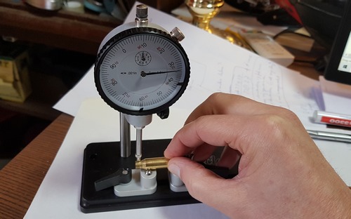 1 maart 2022. Concentriciteitstest Willekeurig 6 stuks van de op 28 februari gemaakte 'superpatronen' laten een slingering zien, gemeten op de kogel vlak buiten de hulsnek, van 0.002" to 0.003". Twee tot drie duizenste van een inch is prima naar verluid.