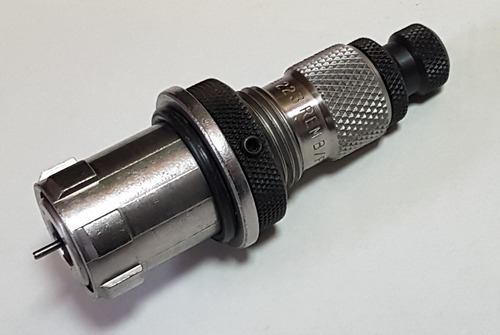 5 februari 2022. Hornady lock & load die systeem In Hildo's Rock Chucker pers zit een insert met 7/8" draad voor de dies. Dat is een standaard maat die gebruikt wordt voor alle dies. Als u die insert verwijderd dan zit er draad met een grotere diameter, geschikt om dies te kunnen monteren voor bijvoorbeeld de erg grote 50 BMG, die in Nederland geen dicipline heeft voor sportschutters en derhalve niet toegelaten is. Hornady insert Als de standaard 7/8" insert is verwijderd schroeft Hildo het speciale Hornady Lock & Load insert er voor in de plaats. Deze is compatible only met de bijbehorende Hornady Lock & Load die-bushing. In feite is het een bajonet aansluiting. Hornady die-bushing De die wordt in de bushing geschroefd en dan in de pers gezet. Dan de die afstellen als gewoonlijk. Om de die te verwisselen pakt u de die beet en, doormiddels de bajonet systeem, kunt u nu letterlijk in een kleine draai de dies verwisselen. Speling wordt weggenomen door de rubber ring die het systeem spelingsvrij laat werken. Alle dies die nu gebruikt gaan worden in de Rock Chucker moeten natuurlijk wel even voorzien worden van een Hornady Lock & Load bushing. Eenmaal afstellen en voortaan 'Lock & Load'! Het systeem werkt op zich prima maar toch fractionele verschillen kunnen zich voordoen als de die wat anders (gedraait) in de pers gezet wordt. Ook slijtage zou een punt kunnen zijn, de die-bushings zijn van aluminum.