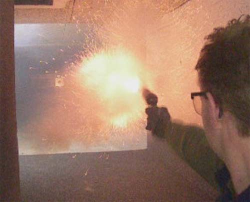 11 augustus 2006. De Dragoon uitdaging! Geen woorden maar daden, dat is het lijflied van iedere echte kerel. Hildo stond net met de geladen Dragoon op de baan en ene Meneer P., naar horen zeggen een goed schutter, toevallig ook. Hildo was van mening dat Meneer P. maar eens moest laten zien dat ie beter is dan Hildo. Nee, niet terugkrabbelen maar schieten! Meneer P. had geen andere keus dan zijn reputatie op het spel te zetten, de Dragoon ter hand te nemen om hem vervolgens leeg te schieten op de kaart. Nog voor het eerste schot viel, kreeg Hildo al wat twijfels. Het leek of Meneer P. een onzichtbare steun onder zijn hand had. Waar Hildo er rustig op los bibbert, valt bij Meneer P. geen trilling te bespeuren. Schot na schot bleef de hand met de toch behoorlijk zware revolver als uit steen gehouwen op de kaart gericht. Het kan aan de baanverlichting liggen of werd Hildo daadwerkelijk een tintje bleker?