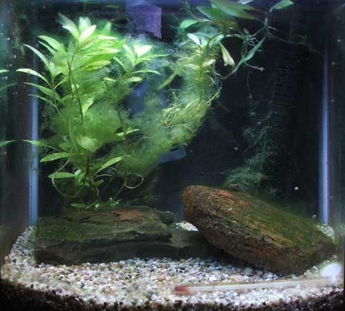 Alg De alg die nu nog over is, is te verwaarlozen. U ziet hier wat blauwalg boven op het houtblok. Dat is geen enkel probleem, Hildo hoeft het niet te verwijderen. Soms groeit het iets aan, soms wordt het weer wat minder. Het lijkt erop dat een waterverversing, iets van drie emmers, dus 30 liter, al een positieve uitwerking heeft. Waterverversen Dat doet Hildo weinig. Iets van één emmer of misschien twee emmers in één of twee maand. Een echte vaste regelmaat heeft Hildo niet. Filter verversen Ook iets wat Hildo zeer weinig doet. Misschien éénmaal in de drie, vier maanden. Hij spoelt het filter dan grofweg uit, zowel het onderste als bovenste gedeelte in één keer. Dit onder een lauwe kraan opdat de bactieriën niet te veel van slag raken. Daarna gaat het filter terug in het aquarium. Het filter is nog steeds het originele binnenfilter van het Jewel aquarium en lijkt het eigenlijk best goed te doen. Zijn voornemen om een groter extern filter aan te schaffen in verband met het algprobleem, heeft Hildo laten varen. Visbezetting Die is laag. 'Het is beter voor de bak', volgens Hildo. Minder verontreiniging en meer rust voor de vissen zelf. 'Rust is belangrijk', meent hij. Als u dooie vissen en ellende wilt, moet u uw bak propvol stoppen. Een volle bak vindt Hildo op aquariumgebied een echte no-go. Op dit moment zitten er, behalve Klaus de Synodontis Aterrimus, zes corydorassen en iets van twaalf roodkopzalmpjes in. Verder niets, behalve wat puntslakken, soms meer, soms minder... maar die hoeft u niet te kopen.