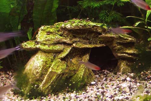 Stenen Iets in de bak, waaronder Albert zich verschuilen kan, is natuurlijk noodzakelijk. Daarom heeft Hildo twee platte stenen, half op elkaar, in de bak liggen. Albert kan zich eronder verstoppen, dat is wat hij graag wil. Stukken beter dan onbeschermd in het felle tl-licht van de bak moeten liggen. De plastic grot De hier boven genoemde grot had Hildo in eerste instantie voor Albert aangeschaft om een mooie donkere plek voor hem te creëren. Maar de grot staat al twee maand in het grote aquarium, waar hij niet misstaat. Albert kent z'n bakkie nu en als Hildo de stenen weghaalt, wordt het natuurlijk wel heel erg wennen voor hem en... ach deze stenen zijn ook nog niet zo raar, toch? Evengoed denkt Hildo dat hij binnenkort voor Albert in de Aqua 40 alsnog een plastic grot aanschaft.