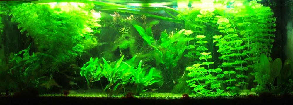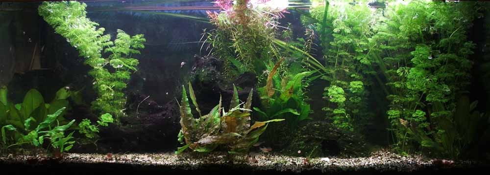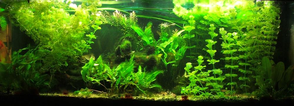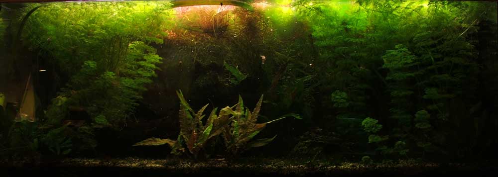 plukken Op de twee foto's hierboven ziet u het aquarium vóór (bovenste) en na het uitdunnen van de planten (onder). Beide foto's zijn met dezelfde belichtingstijd genomen, maar ze lijken donkerder dan het in het echt is. Zelfs zo'n vol gegroeide bak ziet er best leuk uit, maar op een gegeven moment moet er wel wat aan gebeuren. Naast af en toe het filter verversen en de ruit schoonmaken is dat het wel ongeveer wat het onderhoud betreft. De stand van zaken Niet zoveel updates, denkt u, en dat klopt helemaal. Het gaat al geruime tijd uitermate goed met het aquarium. Last van overmatige alg, wat geruime tijd een zeer beklemmend probleem is geweest, heeft Hildo niet meer. Hij heeft dit ook niet meer gehad sinds de laatste updates. Het onderhoud Het aquarium vergt dus nauwelijks enig onderhoud.