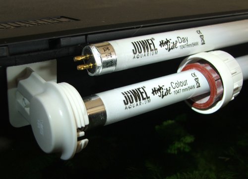 6 december 2014. Nieuwe Juwel lichtbak: 119,50 euro Vandaag de dag is led-verlichting the way to go, veel licht voor weinig energie en het is zelfs mogelijk kleuren te laten wisselen door de led's high-tech aan te sturen zodat 's ochtends de zonopgang en 's avonds de zonsondergang wordt nagebootst en het 's nachts lijkt of de maan schijnt. Maar op dit moment nog even niet voor Hildo. Hij houdt het simpel en gaat voor vervanging van de kapotte lichtbak door een nieuwe, ook van Juwel. Ouderwets klik-aan en klik-uit. Hij wil er na aanschaf niet achterkomen dat het een of ander ineens niet compatibel blijkt te zijn of anderszins tegenvalt. Moderne tl-buizen? Blijkbaar staat de tijd ook niet stil waar het tl-buizen betreft. De nieuwe tl's zijn duidelijk dunner dan de oude en geven meer licht. Normale (ouderwetse) 26 mm dikke tl's zijn van het type 'T8', de nieuwe dunne van 16 mm gaan onder de typenaam 'T5'. De T5-modellen hebben meer lichtopbrengst, maar of dat komt door het energiezuinige ontwerp of door het hogere wattage is Hildo nog niet duidelijk. De T5-tl is volgens de specificaties 54W, terwijl de 'normale' T8-buis het doet met maar 38W. Energiezuiniger zijn ze dus niet, ze verbruiken juist meer. Een ander voordeel ziet Hildo ook niet direct, hij had geen probleem met de T8-buizen. Maar hoe dan ook, Hildo is over naar T5. T8 en T5 niet uitwisselbaar De aansluitingen zijn verschillend. 'Jammer', vindt Hildo.