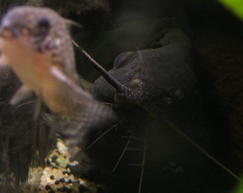 29 december 2014. Claus, een decennium in de bak! U kent Claus vast nog wel, de Synodontis Aterrimus. Misschien is het toch een Synodontis Eupterus? Hildo beraadt zich er nog op. De juiste soort determineren kan soms best lastig zijn. De Eupterus zou geluid kunnen maken als hij verstoord wordt, maar Hildo heeft Claus nog nooit gehoord. Tien jaar Hildo heeft precies tien jaar geleden, december 2004, dit aquarium gekocht en opgestart. En Claus en Bernhard zijn begin januari hun leven als superklein visje in het aquarium begonnen. Broer Bernhard al weer jaren dood, sinds 2006, maar Claus is er nog steeds. Het is een tamelijk imposante, maar bijzonder vreedzame, schichtige reus die altijd achter het houtblok ligt als een gezonken onderzeeër. Wanneer Hildo hem voert, elke dag achter het houtblok, zwemmen met name de Corydoras Leucomelas over hem heen, recht voor z'n bek langs, maar ook de Corydoras Panda en de Roodkopzalmpjes zijn niet bang voor hem. Claus blijft altijd stoïcijns, geeft geen krimp. Behalve wanneer een Corydoras brutaal onder z'n lijf zit te grazen en hij niet goed op de bodem kan liggen. Dan lijkt er íets van irritatie te zijn. Evengoed, een serieuze uitval heeft Hildo nog nooit gezien. In het donker wordt Claus actiever, maar voor een leuk door de bak zwemmende vis wanneer de lampen aan zijn, kunt u wellicht beter iets anders kiezen dan een Synodontis. |