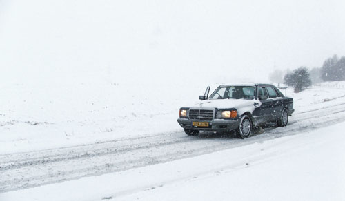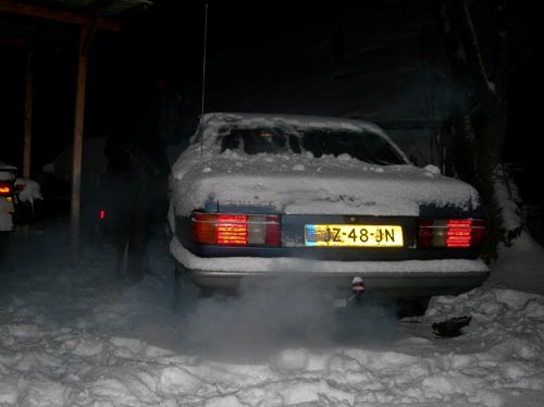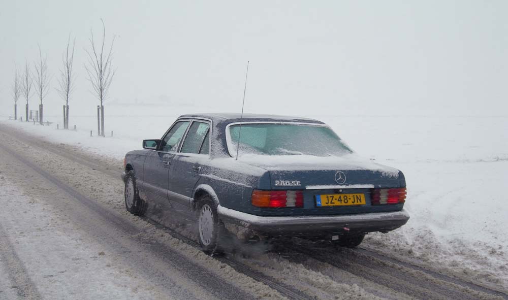 17 december 2009. Sneeuw! 'Toe, toet!' Daar gaat ie. De ergste sneeuw sinds jaren, volgens Hildo. Tamelijke verkeerschaos in Nederland volgens de media, maar hoe brengt zo'n oude 280SE, op zomerbandjes, het eraf in het ondergesneeuwde Groningen? Hildo is bijzonder tevreden over de auto en heeft niets van een verkeerschaos gemerkt. Om dezelfde afstand af te leggen is er alleen twee keer zoveel tijd nodig omdat er in een aangepast tempo gereden wordt. In de sneeuw rijden gaat prima. Alleen, wilt u zo snel mogelijk stoppen, dan lijkt het beter om de automaat vanuit de D (drive) in de N (neutraal) stand te zetten. Hij heeft het idee dat de achterremmen het niet optimaal doen en dat de motor de achterwielen wat door blijft drukken. U kunt uiteraard maar minimaal remmen voordat de voorwielen blokkeren. ABS is een niet gekozen optie door de eerste eigenaar en als de automaat wat door drukt, verkleint dat de remafstand niet. Misschien hoort het wel zo. De laatste keer dat hij met een automaat in de sneeuw gereden heeft, was begin jaren 80: Een poosje terug dus. Misschien was u het dan intussen ook wel vergeten. Pekel Het gebruik van pekel tijdens de winter is niet leuk, in ieder geval niet voor het metaal van een auto want niets vreet zo erg als zout. Het effect van deze winter is de volgende zomer al zichtbaar, weet Hildo. Een goede conservering is letterlijk van levensbelang voor de wagen, dus u weet nu al wel wat er de komende zomer op het program staat. Juist! De hele wagen vol smeren en spuiten met van alles wat maar roestwerend is.