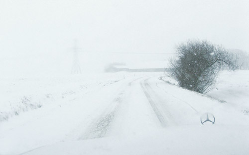 Het zicht vanuit de bestuurdersstoel. Deze S maakt geen probleem van een paar sneeuwvlokjes. Mooie ster voorop, maar er er zo indrukwekkend uitzien als Hildo's oude 230S doet deze 280SE echt niet..
