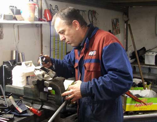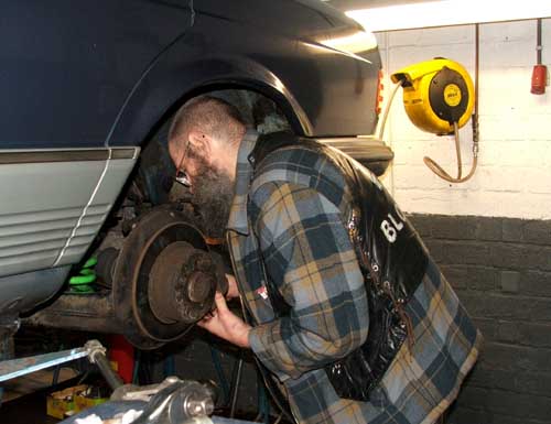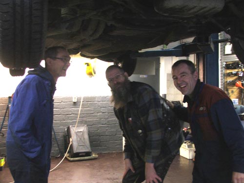 Hildo en de remklauw Na een korte proefrit merkt Hans het al snel: 'De achterremmen zijn niet fris. Beter dat we die even loshalen'. Prima idee en als u denkt dat Hildo maar een beetje staat te lanterfanteren met z'n handen in z'n zakken, dan zit u ernaast. Dit is het echte grote mannen sleutelwerk hoor en Hildo doet het zelf! De andere kant ging stukken sneller want daar sprong Hans even bij.
