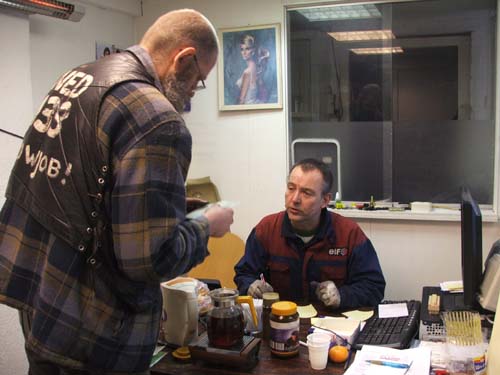 Danker en de remklauw Danker bezig met het voorbereiden van de ruil-remklauw die straks links achter op Hildo's Mercedes een tweede leven gaat beginnen. Honger? Na een poosje kunt u wel wat trek krijgen. Danker: 'Zeg Hildo, zin in een tosti?' Dat laat Hildo zich geen tweede keer zeggen. Smikkel. Bakje koffie? Slurp.
