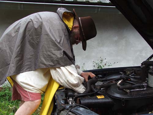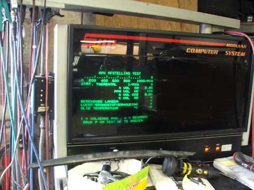 Hans aan de CO Hier ziet u Hans bezig met het afstellen van de verdamper om de CO op het goede niveau te krijgen. Het CO blijkt veel te laag. De wagen liep verder best goed, maar het stationair toerental was te laag en na een poosje voor het stoplicht begon de Mercedes nog langzamer te lopen en ook onregelmatig te draaien, tegen het afslaan aan. Die tijden zijn voorbij, de motor doet het weer als het spreekwoordelijke zonnetje.